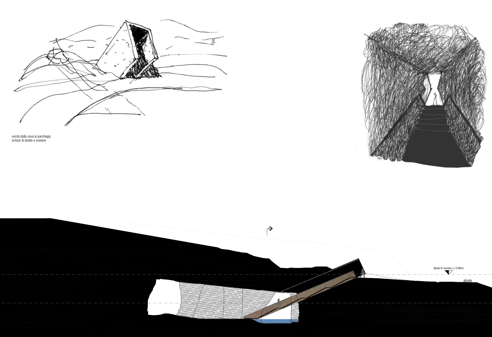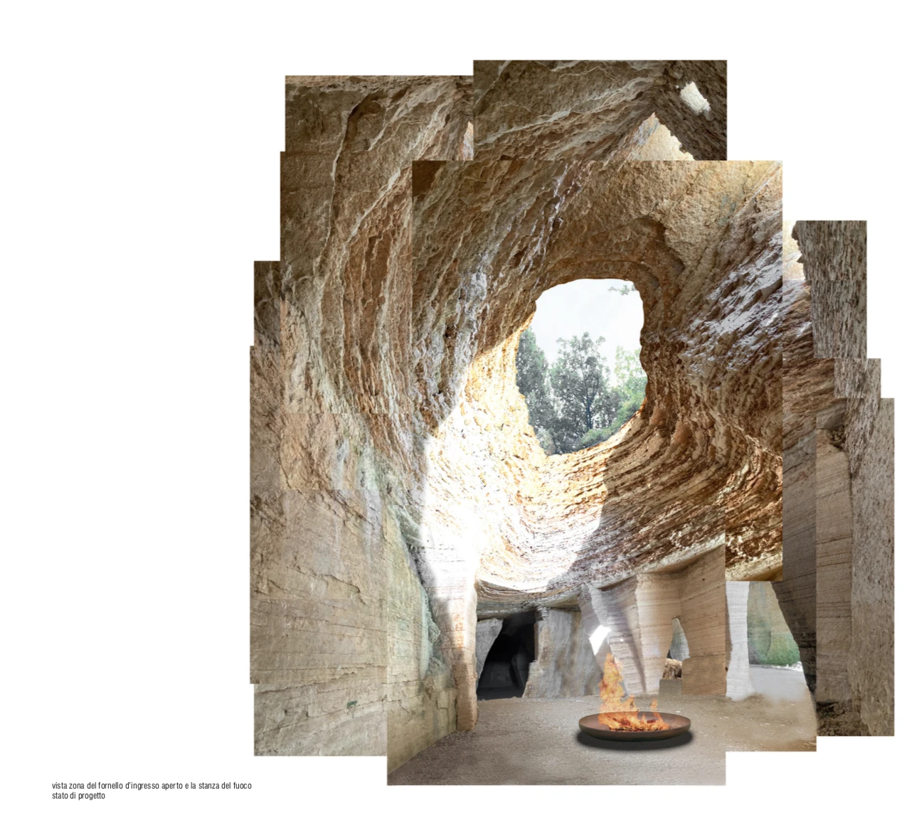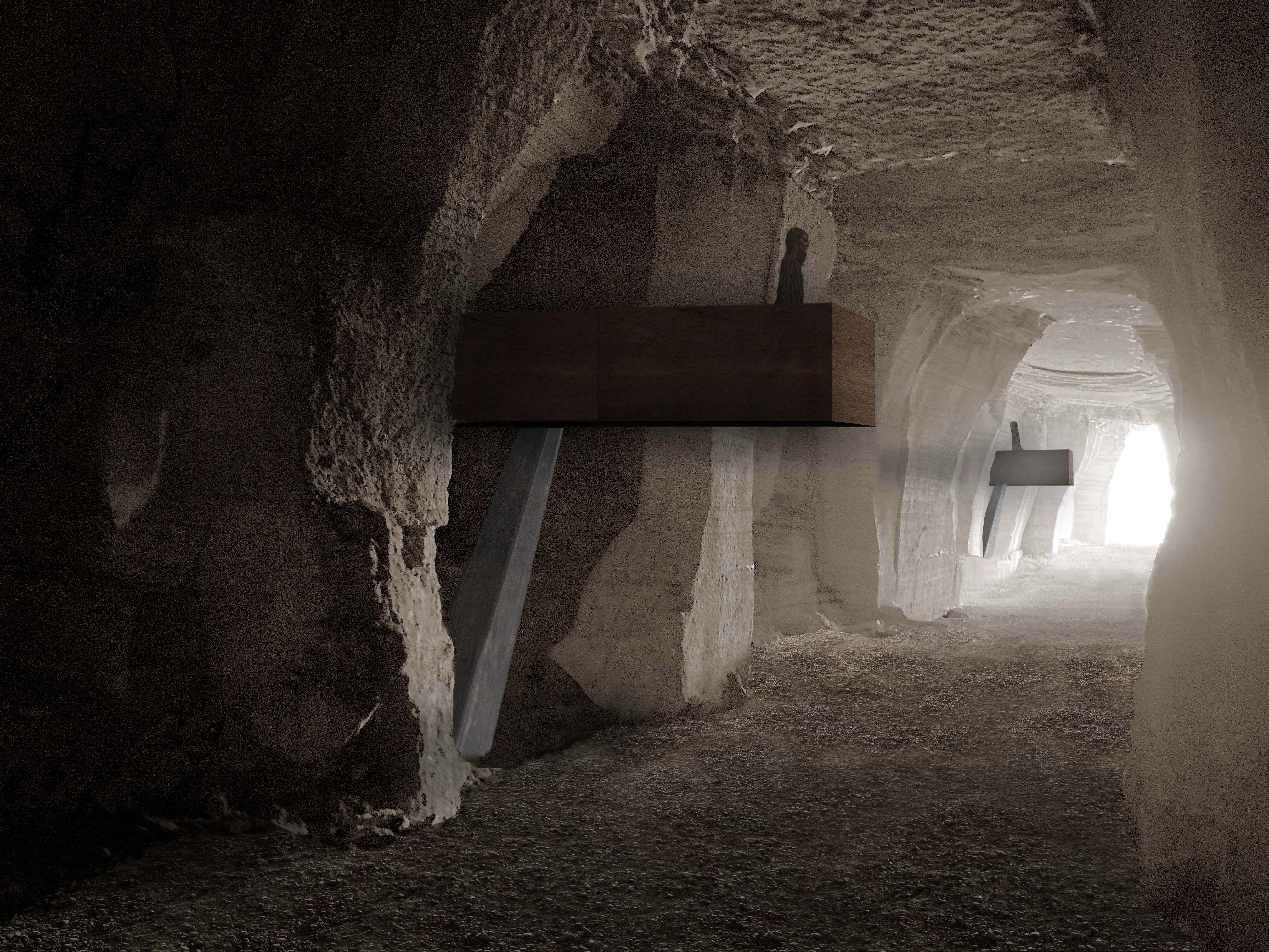 L’intervento prevede innanzitutto il consolidamento, la messa in sicurezza e la pulizia degli elementi, fornelli, setti e pareti che costituiscono l’area della cava. L’aggiunta di nuovi elementi è limitato e funzionale alla permanenza nella cava per una sua nuova lettura.