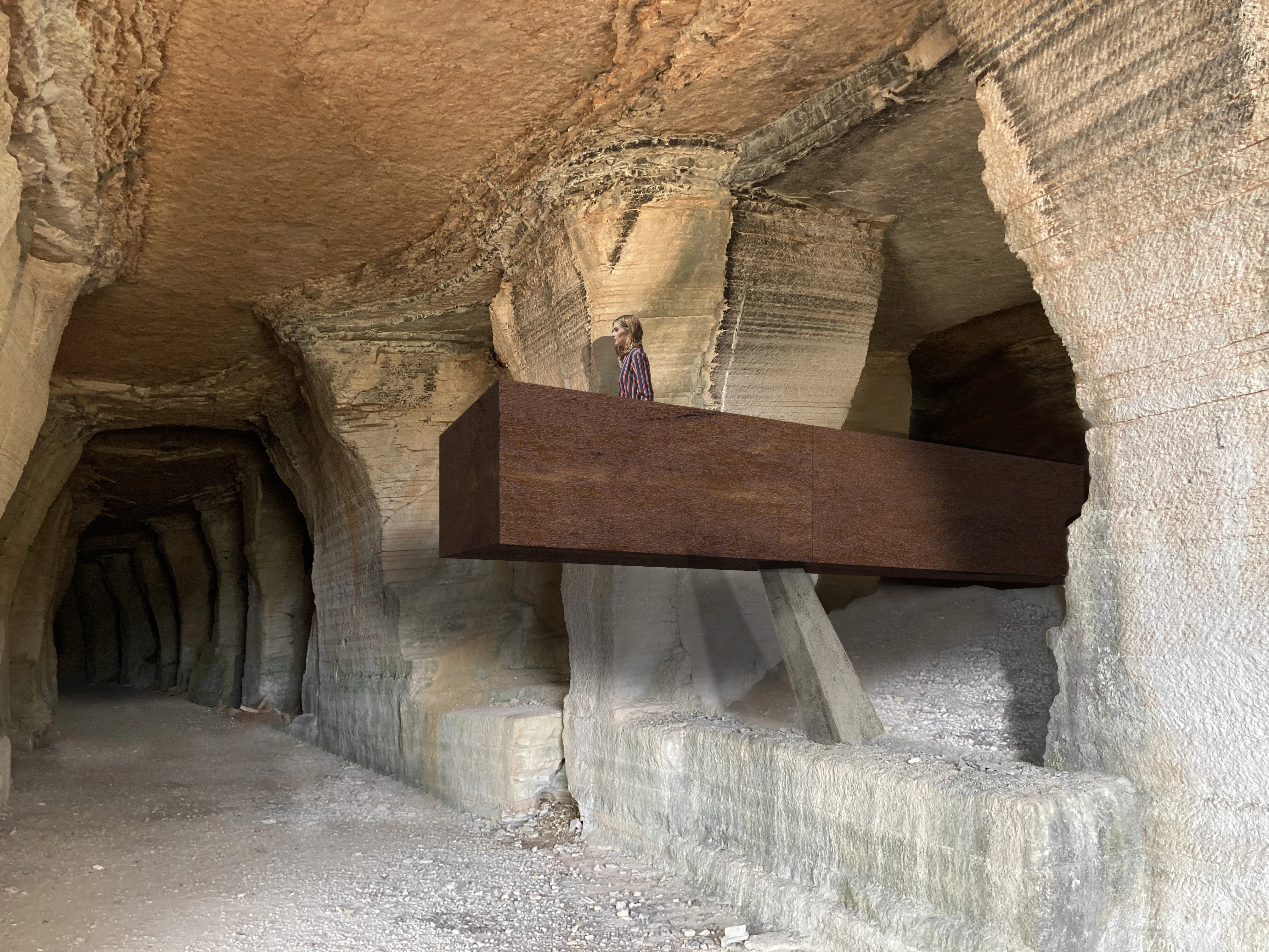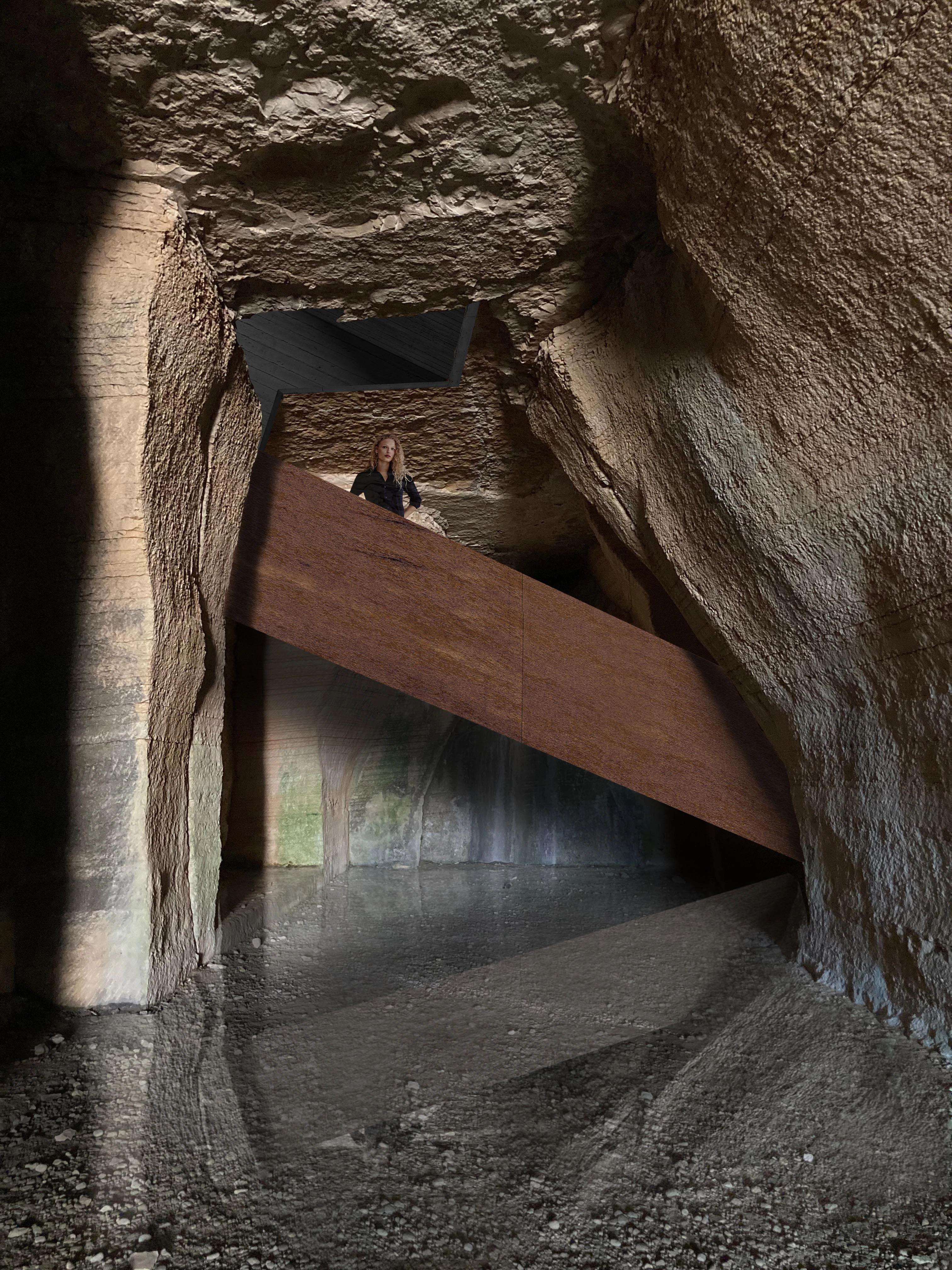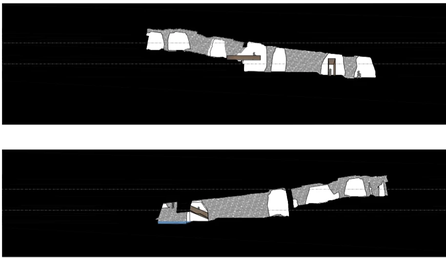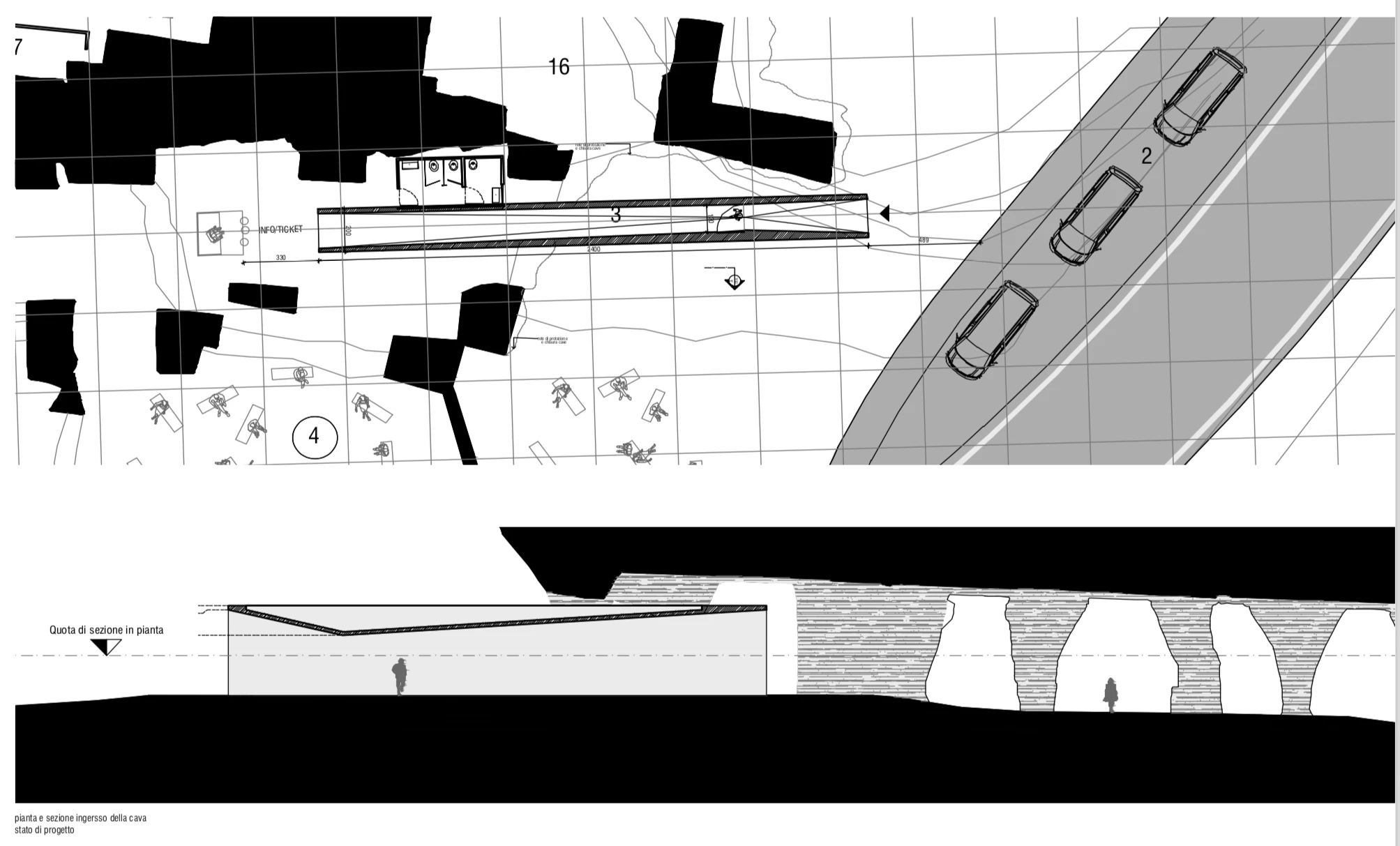 L’intervento prevede innanzitutto il consolidamento, la messa in sicurezza e la pulizia degli elementi, fornelli, setti e pareti che costituiscono l’area della cava. L’aggiunta di nuovi elementi è limitato e funzionale alla permanenza nella cava per una sua nuova lettura.