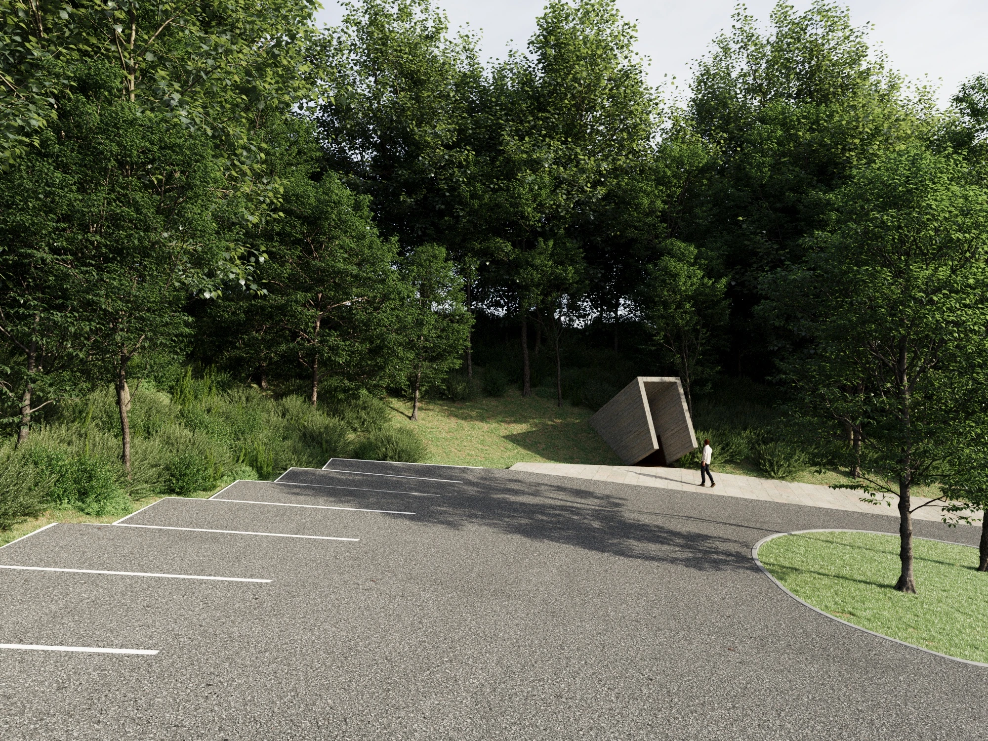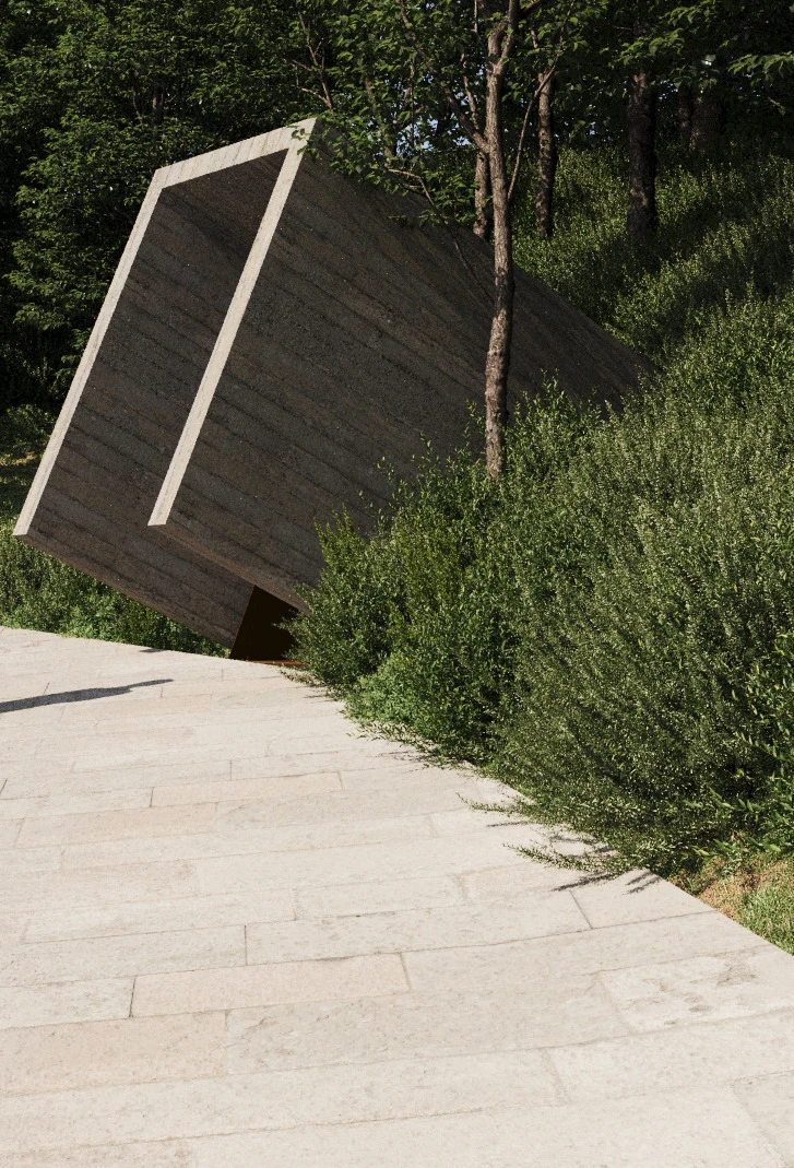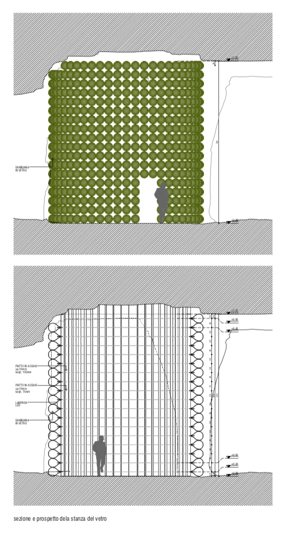 In ingresso come in uscita svilupperemo plasticamente il tema della soglia con due linguaggi vicini ma lontani. L’entrata monumentale, l’uscita dall’esperienza di visita invece discreta, ambigua. Quasi per non ricordarne la fine, un po’ come succede all’uomo che non riesce a ricordare la cosa più importante successa, la sua nascita.