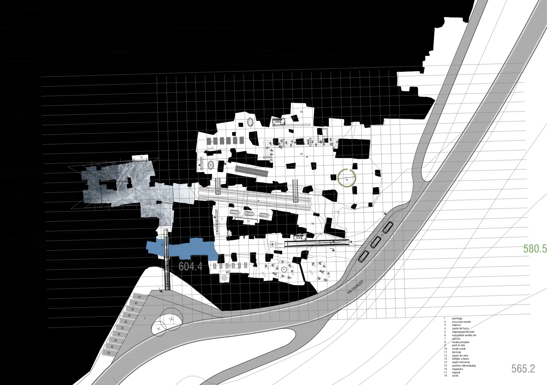 Ci saranno quindi stanze per stare, passaggi per passare, affacci per guardare. Una stanza del fuoco, una stanza del buio, una stanza del vetro, una stanza del vino e la stanza della messa in scena, una sorta di spazio di rappresentazione.